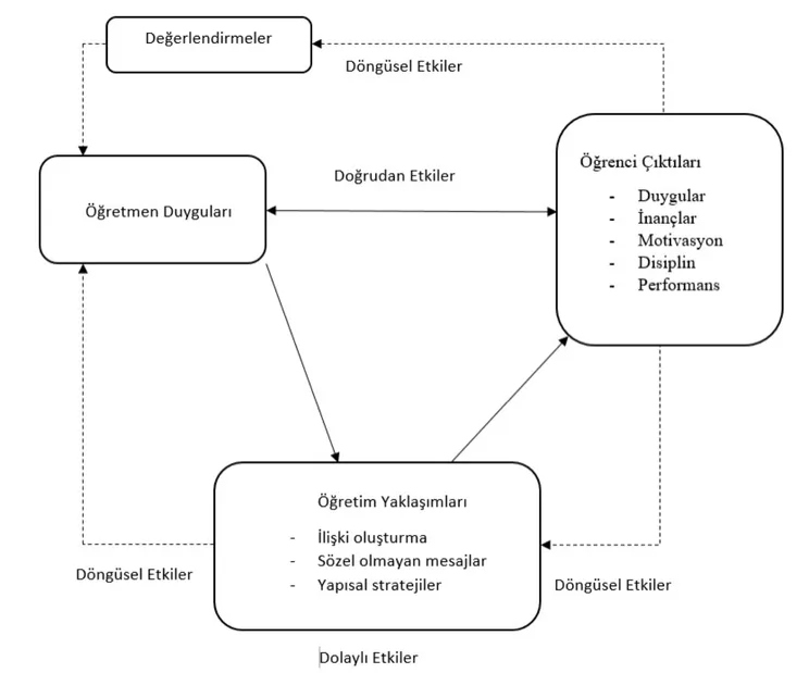 • Aracı Etkiler: Öğretmen duyguları, yalnızca doğrudan değil, öğretim stratejileri ve sınıf yönetimi aracılığıyla dolaylı olarak da öğrenci çıktılarını etkileyebilir. Öğretmenin duygusu, sınıfta ilişki kurma biçimini, verdiği sözel olmayan mesajları ve kullandıkları öğretme stratejilerini etkilemektedir. Tüm bu değişkenler ise öğrencinin duygularını, motivasyonunu, disiplinini ve genel olarak performansını etkilemektedir. Çalışmalar pozitif duyguların, sınıf ortamında daha kaliteli bir iletişimi doğurduğuna, öğretmenlerin daha esnek ve yaratıcı öğretim yöntemleri kullanmalarını teşvik ettiğine, negatif duyguların ise öğretim kalitesini olumsuz etkileyebildiğine işaret etmektedir.